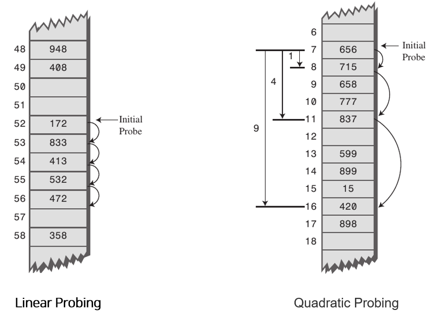 - Quadratic Probing: 해시의 저장순서 폭을 제곱으로 저장하는 방식이다. 예를 들어 처음 충돌이 발생한 경우에는 1만큼 이동하고 그 다음 계속 충돌이 발생하면 2^2, 3^2 칸씩 옮기는 방식이다.