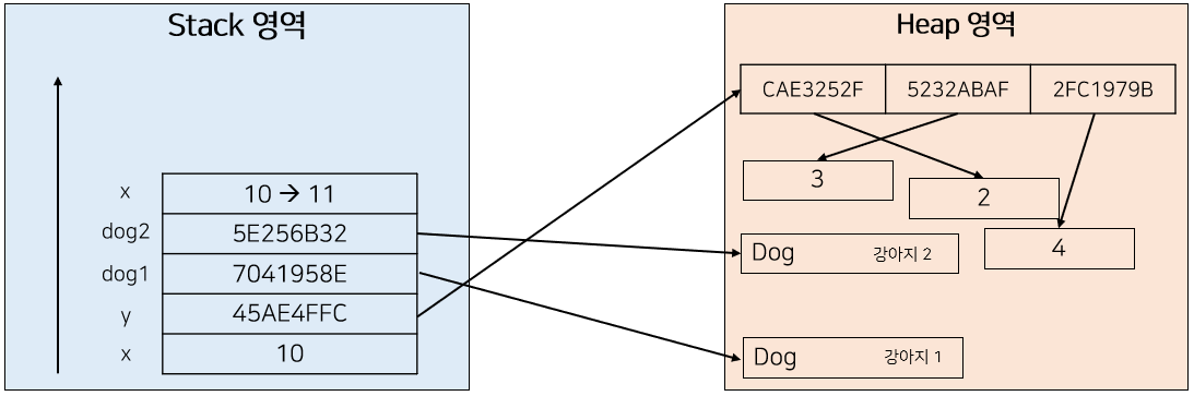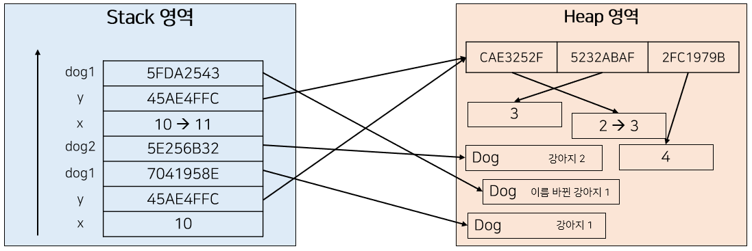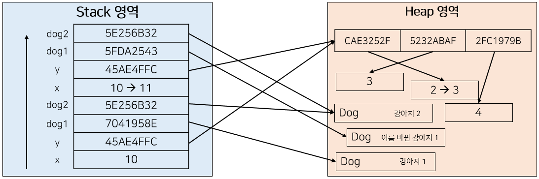 하지만 dog2가 수행하는 연산은 dog1과 다르다. dog2는 새로운 값을 할당하는 것이 아니라, 주소값을 통해 Heap 영역에 존재하는 객체에 접근하여 set을 통해 값을 변화시켜주고 있다.