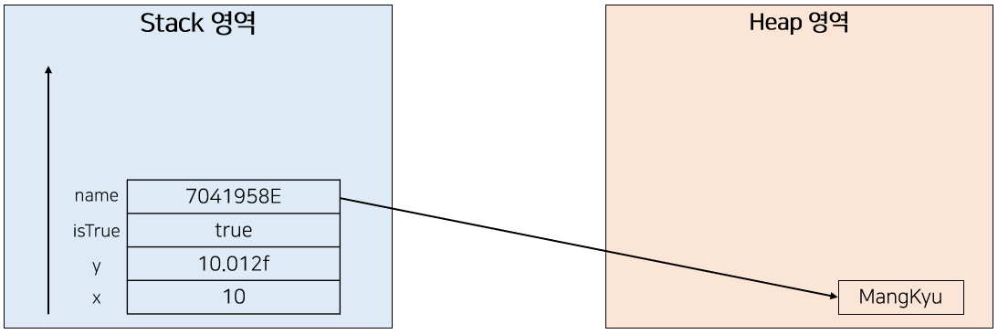 원시변수는 스택 영역에 실제 값들이 할당되었다. 하지만 객체는 원시변수와 다르게 값이 할당된다. 예를 들어 다음과 같은 String 객체를 추가로 생성하였다고 하자.