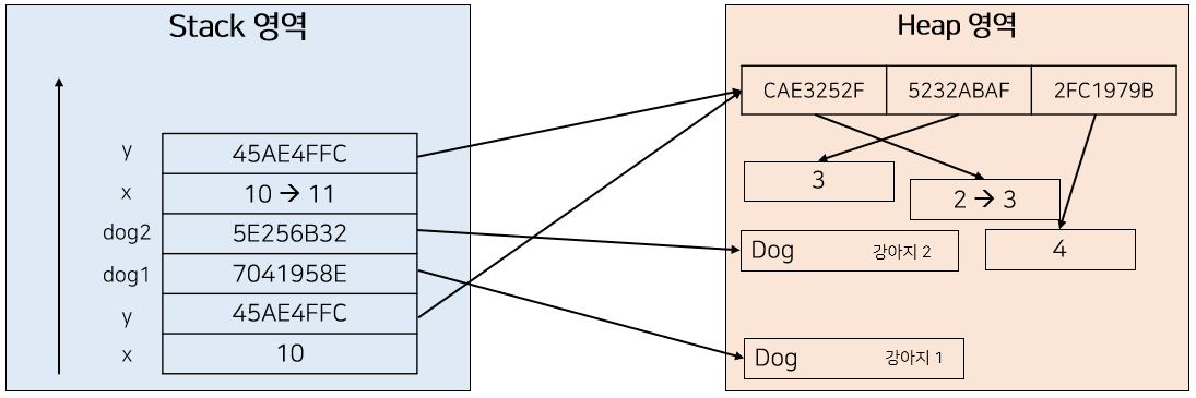 마지막으로 foo() 함수는 네 번째 파라미터로 Dog 클래스의 인스턴스인 dog2를 받고 있다. dog1때와 마찬가지로 Stack 영역에는 새로운 dog2가 할당되고, 실제 dog2의 주소값을 가리키고 있다.