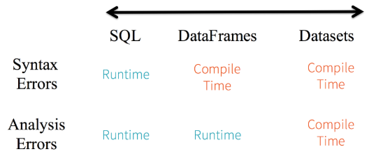 Spark SQL을 통해 작성한 쿼리문의 경우에는 실행 전까지 syntax error를 잡아낼 수 없지만, Data Frame이나 DataSet을 사용하는 경우에는 complie-time에 이를 잡아낼 수 있다. 만약 우리가 DataFrame 또는 DataSet API의 일부가 아닌 함수를 호출한 경우에 컴파일 시점에 에러가 발생하만, 존재하지 않는 column name을 호출하는 것은 runtime 이전까지 감지할 수 없다.