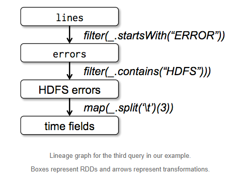 아래의 예제는 HDFS에 저장된 로그로부터 ERROR를 추출한 후 HDFS문자열이 포함된 것을 추출하여 time field를 추출하는 예제이다. 아래의 그래프에서 각각의 Box는 RDD를 뜻한다. 각 RDD는 연결되어 있으며, 해당 Box가 실패하는 경우 이전 단계가로 re-processing을 수행하는 lineage graph이다. 이러한 구조는 In-memory computing에서 Fault Tolernace를 보장하기 위함이다.