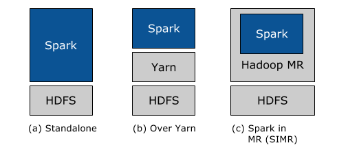 - Yarn을 아직 실행하지 않은 Hadoop의 사용자는 Standalone 외에 SIMR을 통해 MapReduce 안에서 Spark를 사용할 수 있다.