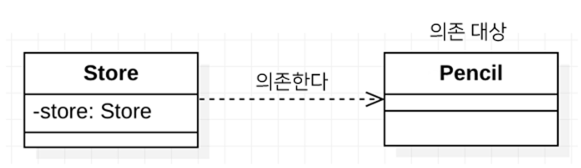 의존성이란 한 객체가 다른 객체를 사용할 때 의존성이 있다고 한다. 예를 들어 다음과 같이 Store 객체가 Pencil 객체를 사용하고 있는 경우에 우리는 Store객체가 Pencil 객체에 의존성이 있다고 표현한다.