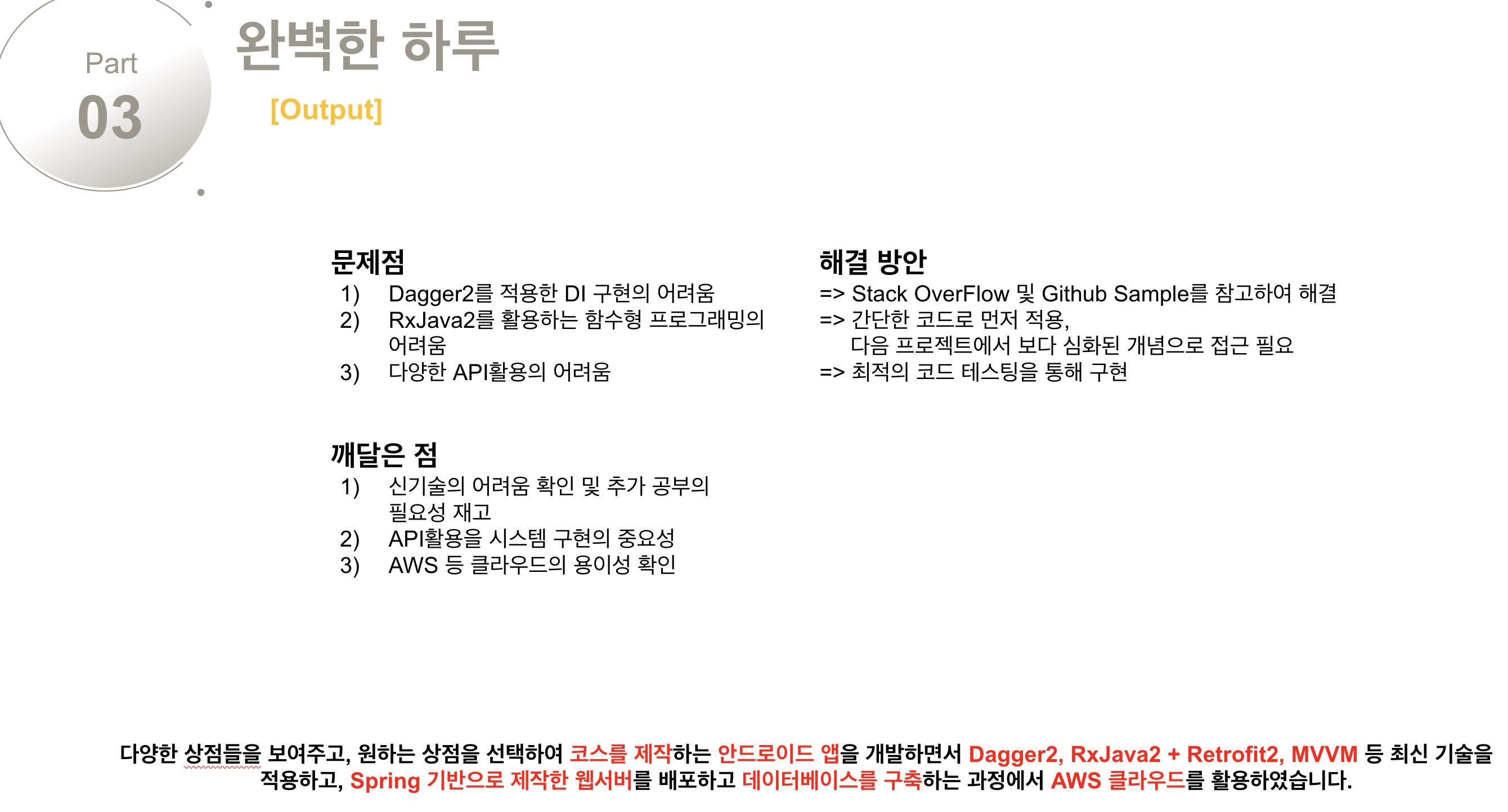 프로젝트 결과 단계에서는 프로젝트를 진행하면서 마주했던 문제점들과 이를 해결한 방안 그리고 이를 바탕으로 깨달은 점을 작성하였습니다. 그리고 화면 하단에 한 줄 요약으로 정리하면서 정리하고자 하였습니다.