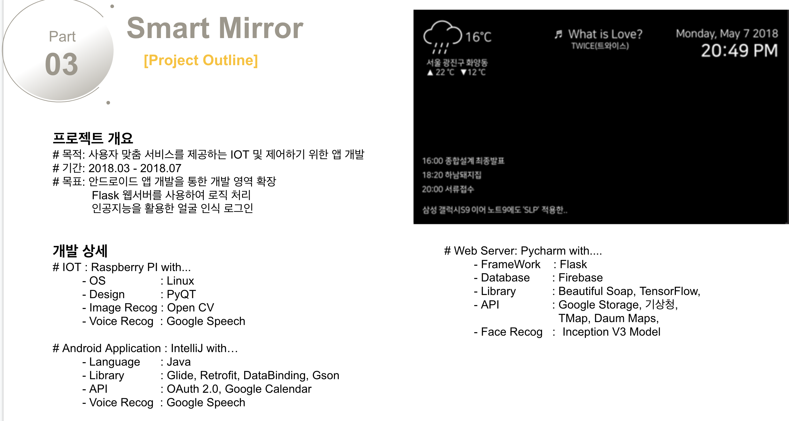 저의 경우에는 PPT 형식으로 본인 소개(신상 및 이력), 보유 기술, 프로젝트 설명, 기타 4가지 목차를 갖는 포트폴리오를 준비했습니다. 포트폴리오의 구성은 여러분 나름대로 다듬으면 될 것이지만 프로젝트 설명 부분만 간단히 얘기하고 넘어가도록 하겠습니다.