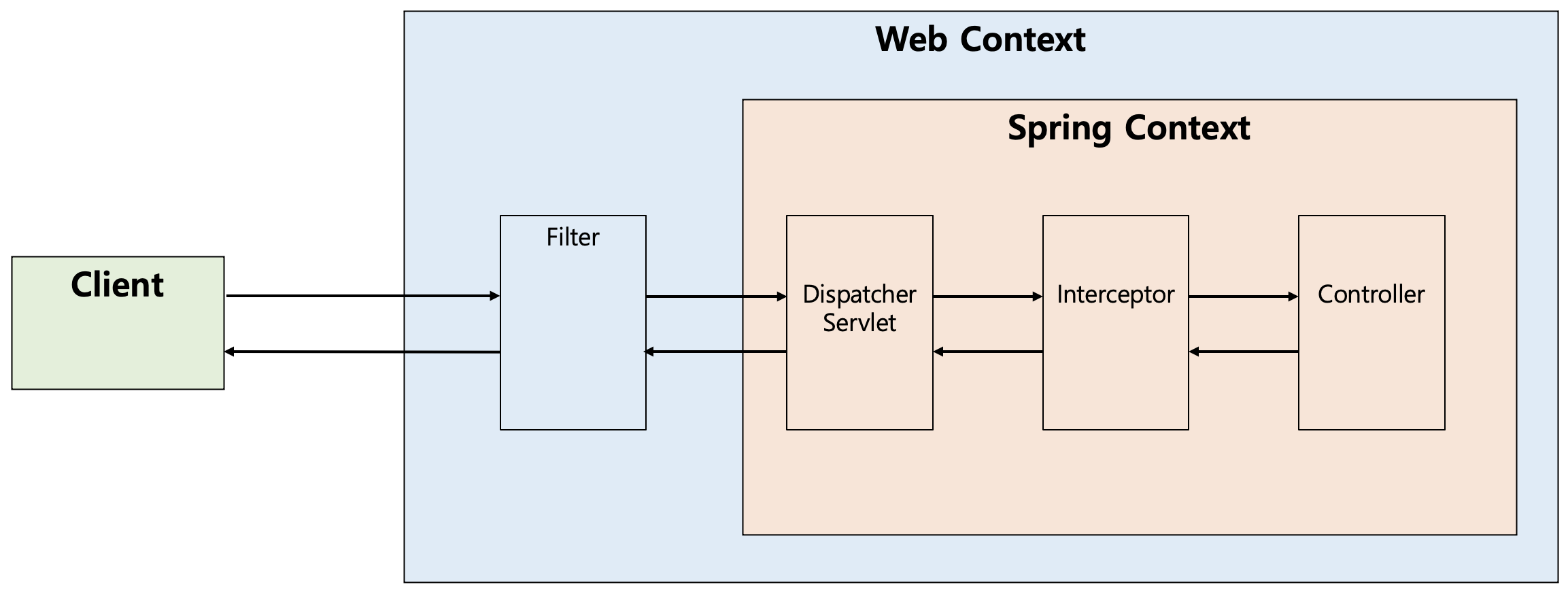 앞서 설명하였듯 디스패처 서블릿은 가장 먼저 요청을 받는 프론트 컨트롤러입니다. 서블릿 컨텍스트(웹 컨텍스트)에서 필터들을 지나 스프링 컨텍스트에서 디스패처 서블릿이 가장 먼저 요청을 받게됩니다. 이를 그림으로 표현하면 다음과 같습니다. 실제로는 Interceptor가 Controller로 요청을 위임하지는 않으므로, 아래의 그림은 처리 순서를 도식화한 것으로만 이해하면 됩니다.