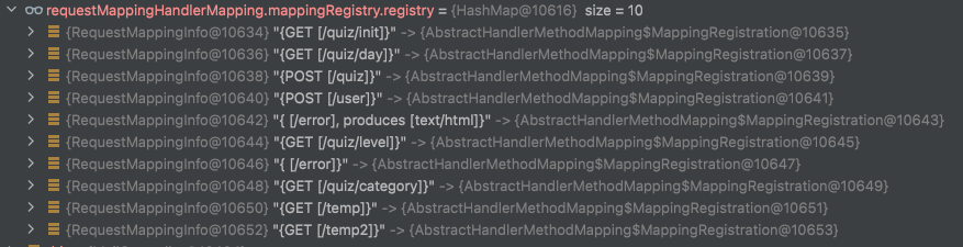 여기서 HTTP 요청을 HandlerMethod 객체로 변환하는 작업하거나 해당 요청에 매핑되는 HandlerMethod를 반환하는 작업은 RequestMappingHandlerMapping이 담당한다. 그래서 애플리케이션 컨텍스트가 초기화되면 RequestMappingHandlerMapping에 접근하여 저장된 매핑 정보와 핸들러 메소드 목록을 확인할 수 있다.