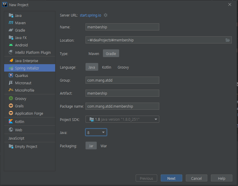 group은 소속된 회사 또는 그룹, artifact는 소속된 집단에서 프로젝트의 타이틀을 적어주면 된다.