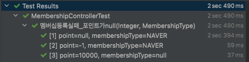우리가 작성한 멤버십 등록이 실패하는 다음의 3가지 테스트는 코드가 상당히 유사하고 파라미터만 다르다. 즉, 중복인 것이다.