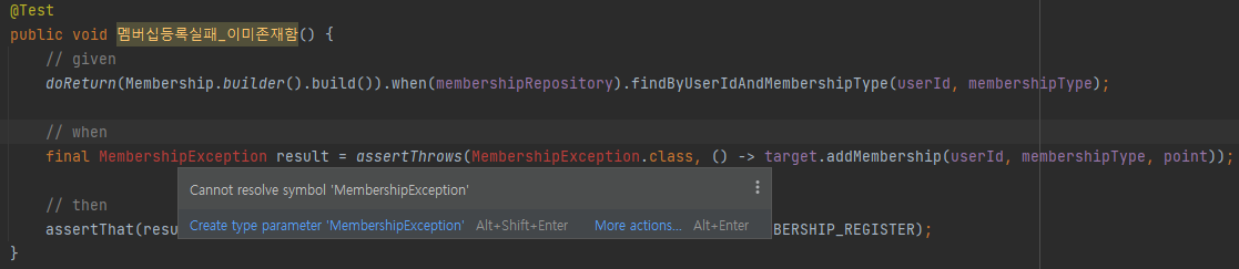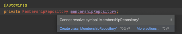 위의 테스트 클래스에서 아직 MembershipRepository는 존재하지 않으므로, 빨간 줄을 띄우며 클래스를 찾을 수 없다는 에러가 보일 것이다.