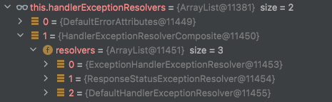 위의 Object 타입인 handler는 예외가 발생한 컨트롤러 객체이다. 예외가 던져지면 디스패처 서블릿까지 전달되는데, 적합한 예외 처리를 위해 HandlerExceptionResolver 구현체들을 빈으로 등록해서 관리한다. 그리고 적용 가능한 구현체를 찾아 예외 처리를 하는데, 우선순위대로 아래의 4가지 구현체들이 빈으로 등록되어 있다.