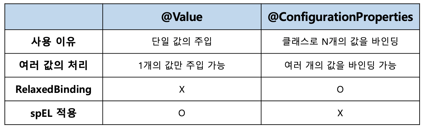 Spring에서는 여러 값을 바인딩받아야 하는 경우에 @ConfigurationProperties를 사용하도록 권장하고 있다. 또한 @ConfigurationProperties는 RelaxedBinding이 적용되므로 보다 유연하게 값을 바인딩할 수 있다.