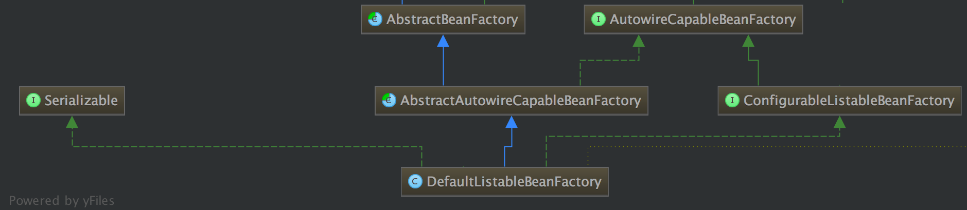 해당 그림을 조금 구체적으로 들여다보면 ApplicationContext가 BeanFactory를 바로 상속받는 것이 아니라 BeanFactory의 자식 인터페이스인 ListableBeanFactory와 HierarchicalBeanFactory를 통해 상속받는 것을 확인할 수 있다.