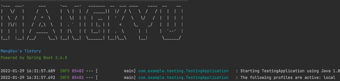 다음과 같이 출력되는 배너의 텍스트 및 색상을 바꿀수도 있고, gif 형태의 배너를 띄울 수도 있다. 관심있으신 분들은 배너를 커스터마이징해보는 것도 재미있을 것 같다. 배너 수정은 Generator로 배너를 만들고 resources 하위에 banner.txt를 넣어주면 된다.