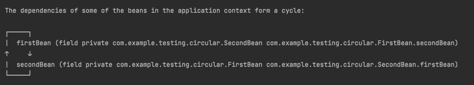 그리고 래핑한 ApplicationArguments와 배너 클래스를 빈으로 등록해주고, 순환 참조 여부와 빈 정보 오버라이딩 여부를 설정해주고 있다. 기본적으로 순환 참조는 불가능하며, 순환 참조가 발생하면 다음과 같은 에러가 발생하며 애플리케이션이 종료된다. (물론 생성자 주입일 경우에만 실행 시점에 발생하고, @Autowired 필드 주입인 경우에는 호출 시에 발생한다. 그러므로 우리는 생성자 주입을 사용해야 한다.) 마찬가지로 동일한 이름의 빈이 여러 개 있을 경우에도 에러가 발생하고 애플리케이션이 종료된다.