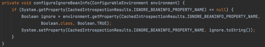 위의 코드는 JSP에서 사용되는 기술인 자바 빈즈(Java Beans)를 위한 작업을 처리하지 않도록 설정해주는 부분입니다. 문제는 environment에서 프로퍼티를 꺼내기 위해 하드 코딩된 "spring.beaninfo.ignore"를 사용한다는 것인데 이 값은 이미 윗 라인에서 사용하고 있는 IGNORE_BEANINFO_PROPERTY_NAME와 동일한 값입니다. 그래서 "spring.beaninfo.ignore"를 사용하는 대신에 IGNORE_BEANINFO_PROPERTY_NAME를 사용하도록 수정하였습니다.