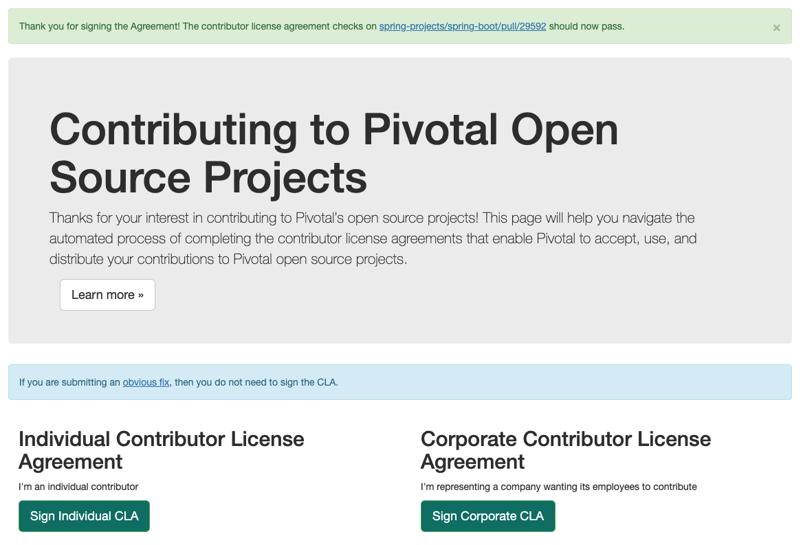 그러면 주어진 링크로 가서 CLA에 Sign을 하면 된다. 개인적으로 컨트리뷰트하는 경우에는 왼쪽의 Sign Individual CLA를 누르고 서명을 하면 된다.