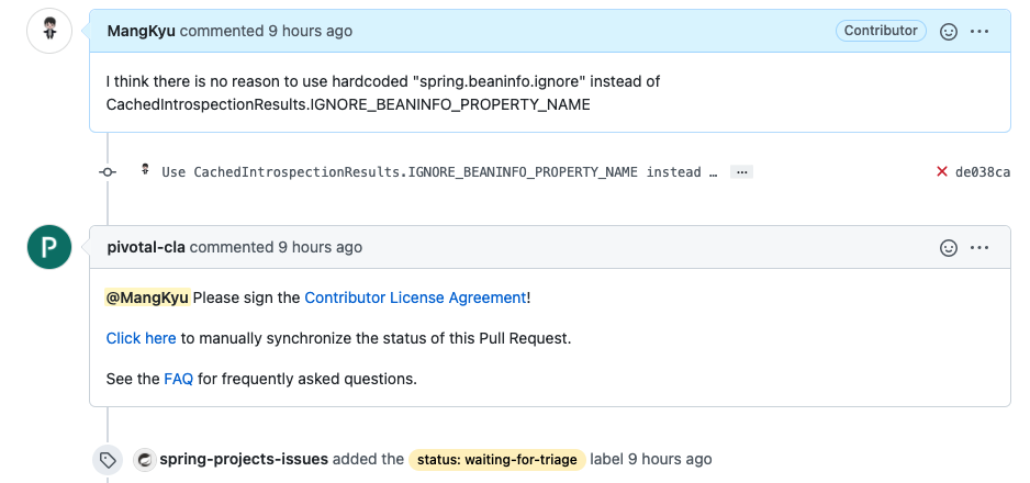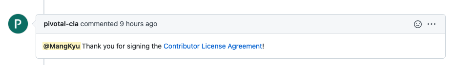 그러면 다음과 같이 CLA에 서명해줘서 고맙다는 코멘트가 달리게 된다.