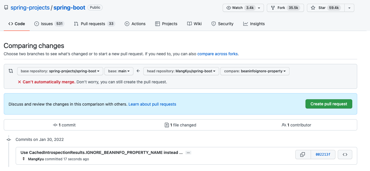 오픈 소스에 컨트리뷰트하기 위해서는 수정할 코드 및 문서 등을 찾아야합니다. 특정 프로젝트의 Issues에 가서 원하는 이슈를 찾아도 되는데, 저는 이번에 SpringBoot 코드를 읽으면서 발견한 내용으로 컨트리뷰트를 하였습니다. 제가 컨트리뷰트한 코드는 다음과 같습니다.