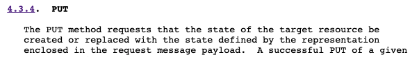 하지만 "전체 수정"을 위한 PUT 메소드에 Payload가 없어야 한다는 것은 이상하고, PUT 관련 RFC 스펙을 보아도 payload가 없어야 한다는 것은 부자연스럽습니다. RFC 스펙을 보면 PUT은 payload에 포함된 내용된 것으로 대체되도록 요청하는 것이라고 명시되어 있기도 합니다.