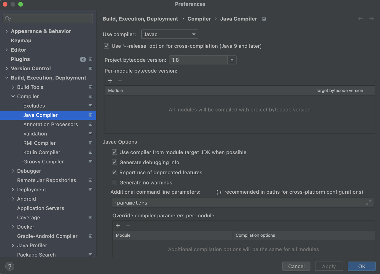 그러면 이제 파라미터 정보를 얻어올 수 있어야 ParameterNamesModule을 활용할 수 있는데, 해당 부분은 자바 컴파일의 parameters 옵션을 사용하면 된다. 자바 컴파일에 parameters 옵션을 추가해주면 JDK8 이상에서는 컴파일 시에 Reflection API로 파라미터 정보를 가지고 올 수 있도록 컴파일된 클래스에 정보를 추가해준다.