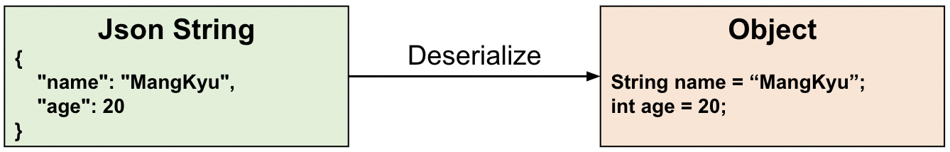 ObjectMapper는 리플렉션을 활용해서 Json 문자열로부터 객체를 만들어내는데, 이것을 역직렬화(Deserialize)라고 한다. Spring에서 @RequestBody로 json 문자열을 객체로 받아올 때 역직렬화가 처리된다.