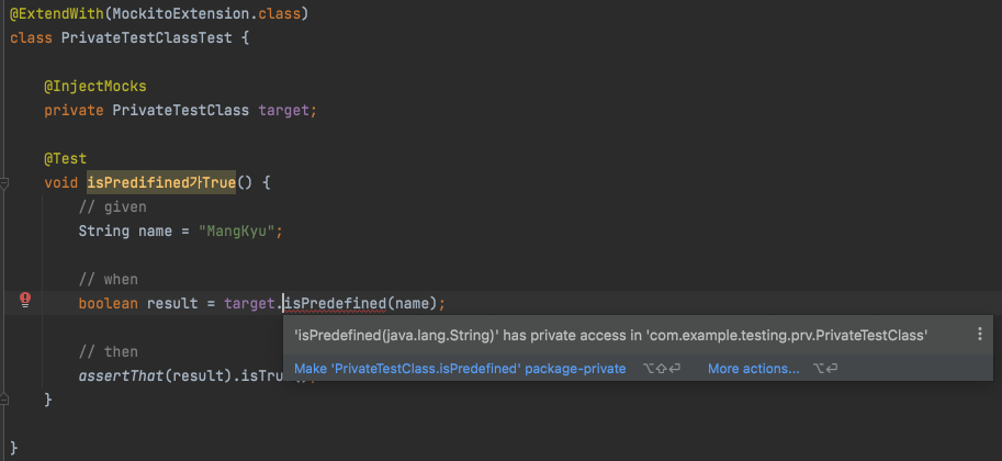 그리고 여기서 isPredefined를 테스트하고자 하는데, 문제는 해당 코드의 접근 제어자가 private이라 일반적으로는 테스트가 불가능하며 컴파일 에러가 발생한다는 것이다. 이번에는 아래의 private 메소드를 테스트하는 방법을 알아보도록 하자.