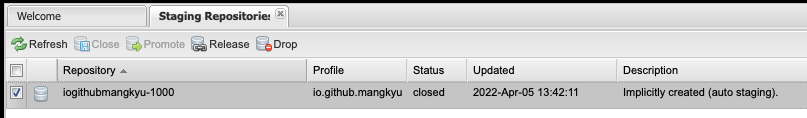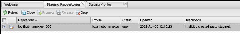 잘 마무리되었다면 스테이지에 배포가 되었을 것이다. 이번에는 레포지토리 관리 링크에서 Staging Repositories를 클릭하면 우리가 배포한 artifact가 보일 것이다. 그러면 여기서 보이는 close를 눌러서 마무리해주도록 하자.