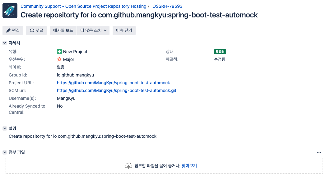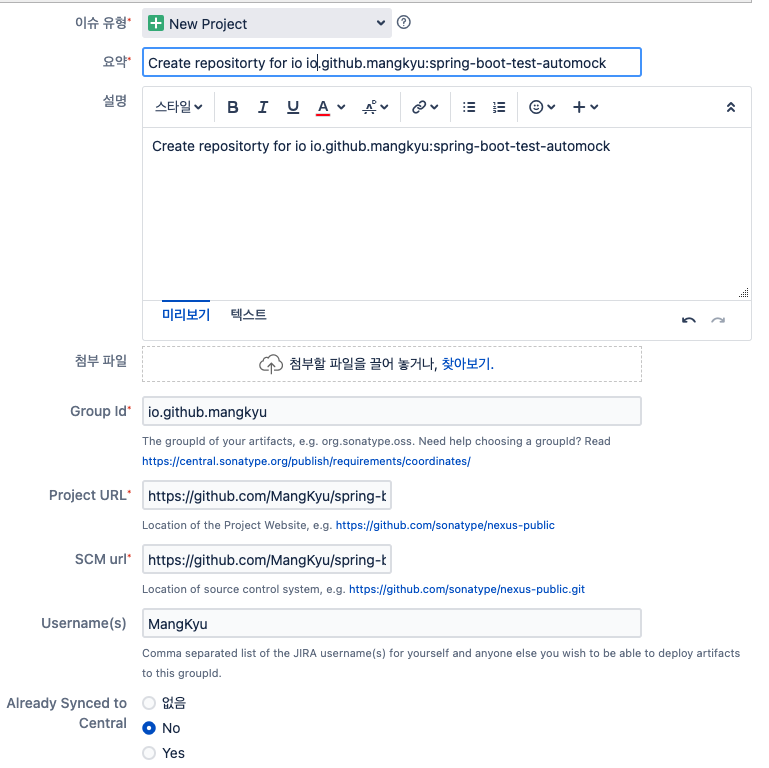 OSSRH에서 오픈 소스를 배포하기 위해서는 지라로 들어가서 오픈 소스 등록을 요청하는 티켓을 만들어야 한다. 그러므로 다음과 같이 본인이 배포할 오픈 소스에 대한 내용을 적어주도록 하자. 여기서 가지고 있는 도메인이 없다면 깃허브 도메인을 이용하기 위해 groupId를 io.github로 시작해주도록 하자.