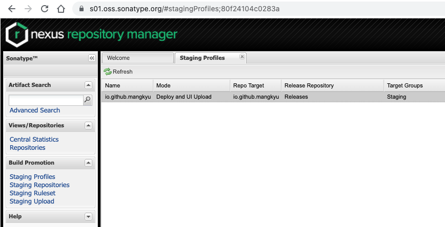 그리고 프로젝트 위치에 local.properties 파일을 생성하고, artifact를 배포할 정보를 입력해주어야 한다. 그 전에 한가지 profieId를 확인해주어야 하는데, 먼저 레포지토리 관리 링크로 들어와 로그인하도록 하자. 그리고 로그인하여 왼쪽의 Staging Profile로 접속하자. 그러면 다음과 같이 하나의 정보가 나오고 그걸 누르면 주소 창에 프로파일 아이디(80f24104c0283a)가 나온다. 이를 보관하고 있도록 하자.