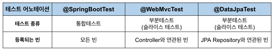 (@SpringBootTest, @WebMvcTest, @DataJpaTest)