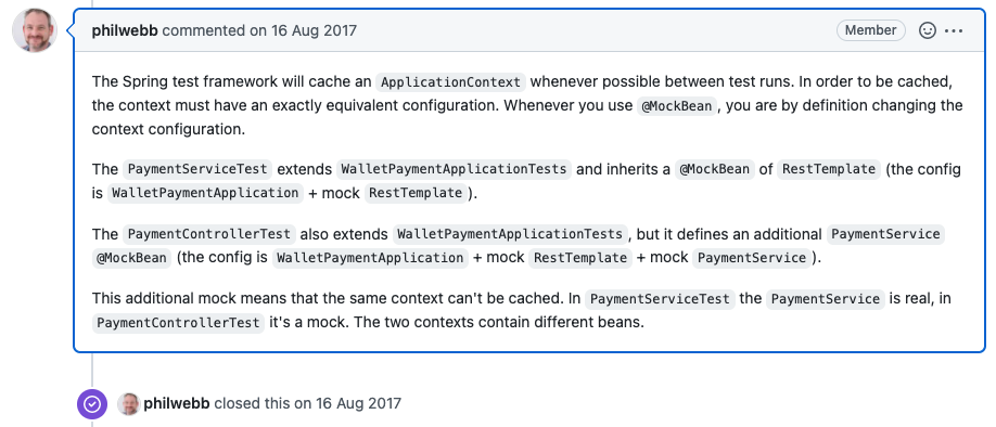 @MockBean과 @SpyBean에 의해 애플리케이션 컨텍스트가 리로딩되는 상황은 이미 이슈로 등록된 적이 있었다. 하지만 스프링부트 개발자 philwebb은 두 컨텍스트가 다른 빈을 가지므로, 문제가 아니라고 설명하였다. 하지만 그렇다고 모든 @WebMvcTest마다 스프링 컨텍스트가 만들어지는 것은 바람직하지 않기에 해결 방법을 찾아야 했다.