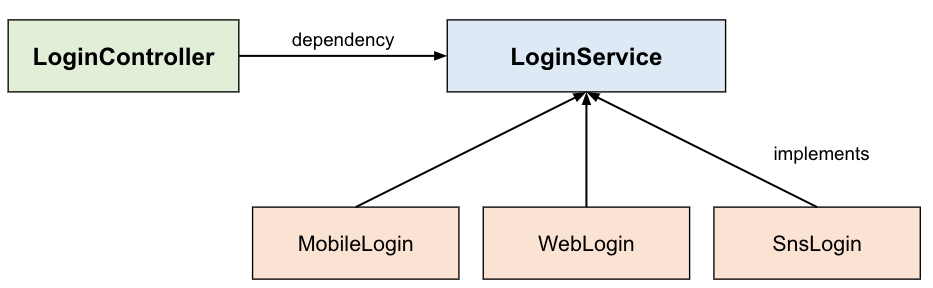 우리가 다양한 로그인 방법을 지원하기 위해 이를 LoginService라는 하나의 인터페이스를 만들고, 웹 로그인, 모바일 로그인, SNS 로그인과 같이 3가지 구현체를 두었다고 하자.