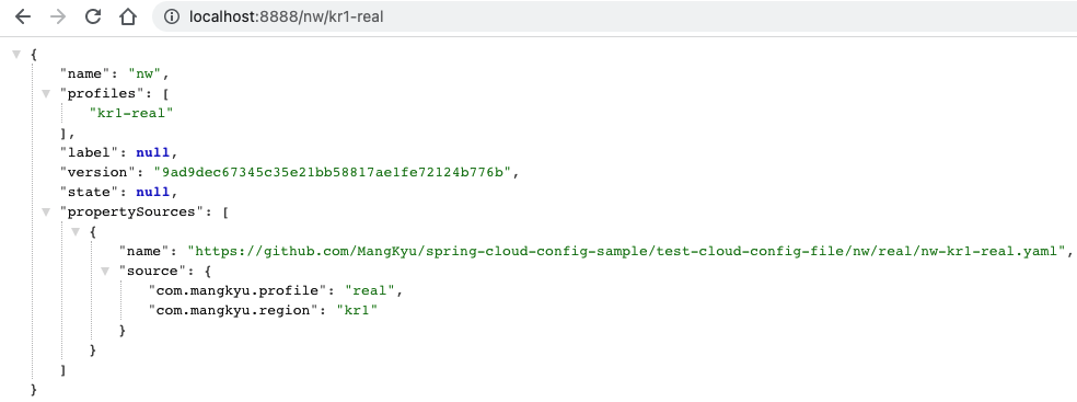 그러므로 다음과 같이 localhost:8888/{앱이름}/{프로파일}로 접근하면 정상적으로 동작함을 확인할 수 있다. 만약 private 레포지토리라면 SSL 설정이 추가로 필요하므로 아래에서 다시 살펴보도록 하자.