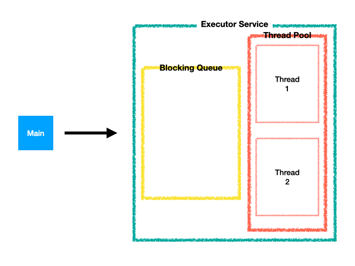 ExecutorService는 작업(Runnable, Callable) 등록을 위한 인터페이스이다. ExecutorService는 Executor를 상속받아서 작업 등록 뿐만 아니라 실행을 위한 책임도 갖는다. 그래서 쓰레드 풀은 기본적으로 ExecutorService 인터페이스를 구현한다. 대표적으로 ThreadPoolExecutor가 ExecutorService의 구현체인데, ThreadPoolExecutor 내부에 있는 블로킹 큐에 작업들을 등록해둔다.