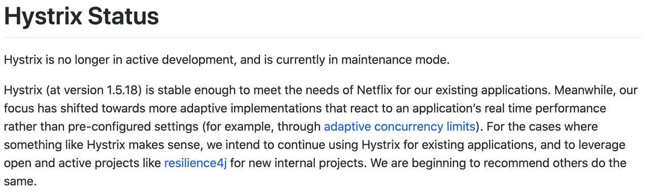 자바 진영의 서킷 브레이커 라이브러리로는 크게 Hystrix와 Reslience4J가 존재한다. Hystrix는 넷플릭스에서 만든 오픈소스인데, deprecated되었으므로 reslience4j를 사용하면 된다. Hystrix에서도 오픈소스인 resilience4j 사용을 권장하고 있다.