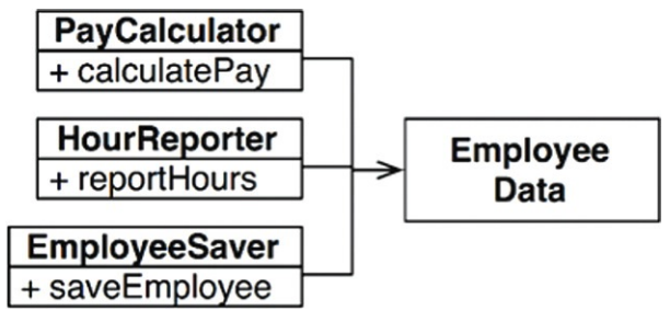 - Employee 클래스는 3가지 메소드가 서로 다른 3명의 액터를 책임지므로 SRP를 위반함