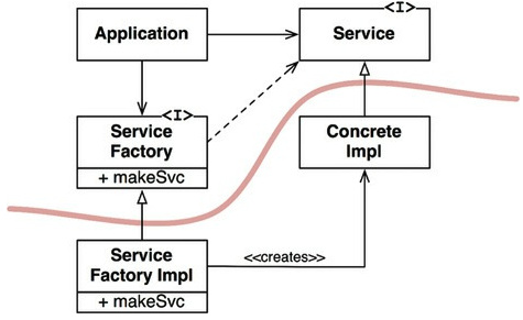- Application은 ConcreteImpl에 대한 소스 코드 의존성을 만들지 않으면서 인스턴스 생성을 위해, ServiceFactory 인터페이스의 mackSvc 메소드를 호출함