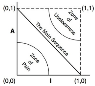 - 최고로 안정적이며 추상화된 컴포넌트는 좌측 상단(0,1), 최고로 불안정하며 구체화된 컴포넌트는 (1,0)에 위치함
