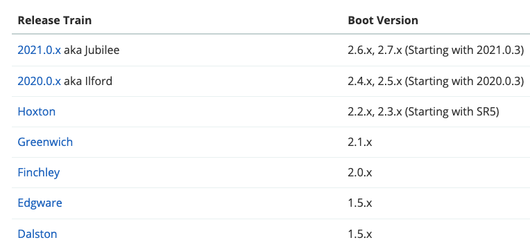 Open Feign은 Spring Cloud 기반의 기술이므로 Spring Cloud에 대한 의존성이 필요하다. Spring Cloud 문서를 보면 현재의 Spring Boot 버전에 맞는 버전이 명시되어 있는데, 적합한 버전을 확인한다.