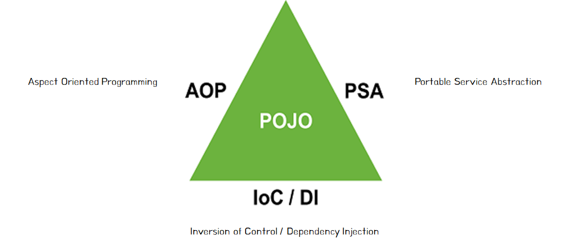 스프링의 핵심이 POJO라는 사실은 스프링의 핵심을 가장 나타내는 스프링 삼각형을 통해서도 알 수 있다. 이 그림은 스프링 소스의 CTO인 아드리안 콜리어가 스프링의 핵심 개념을 설명하기 위해 만들었다. 스프링의 주요 기술인 Ioc/DI, AOP, PSA는 애플리케이션을 POJO로 개발할 수 있게 해주는 가능 기술들이며, 이것들은 모두 스프링이 있기 전에도 여러 가지 형태로 시도됐고 발전하던 기술이었다.