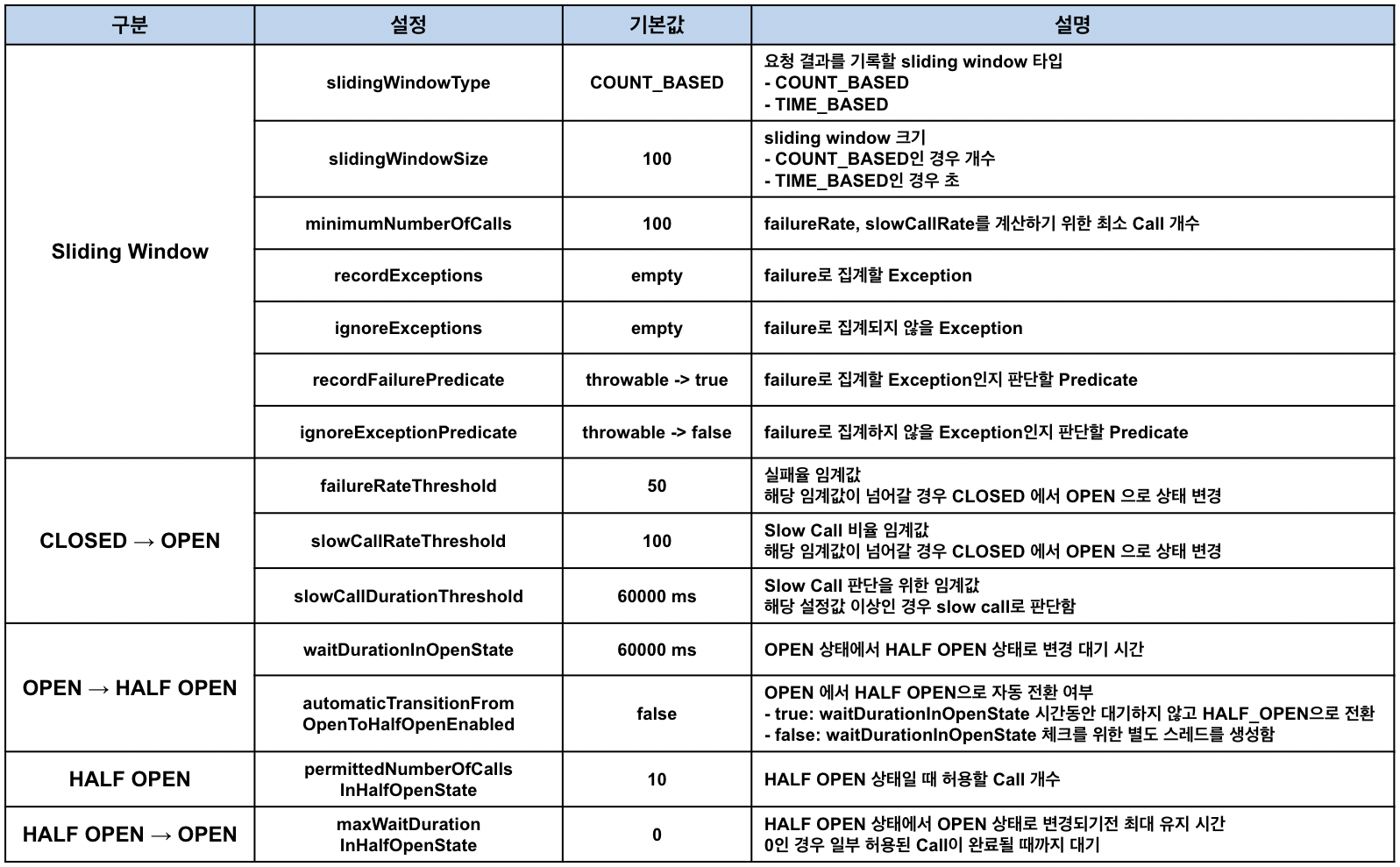waitDurationInOpenState: 30s # HALF_OPEN 상태로 빨리 전환되어 장애가 복구 될 수 있도록 기본값(60s)보다 작게 설정