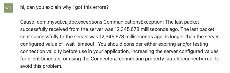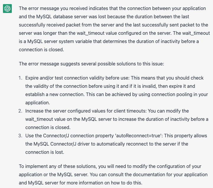 ChatGPT는 친절하게 답변을 해주었다. 내용은 애플리케이션과 MySQL 데이터베이스 사이의 커넥션이 끊어졌고, 그 이유는 MySQL 서버에 설정된 wait_timeout이라는 설정값보다 패킷을 주고 받은 시간이 넘었기 때문이라는 것이다. wait_timeout은 커넥션을 비활성화 할 기간을 결정하는 MySQL 서버의 시스템 변수라고 한다.