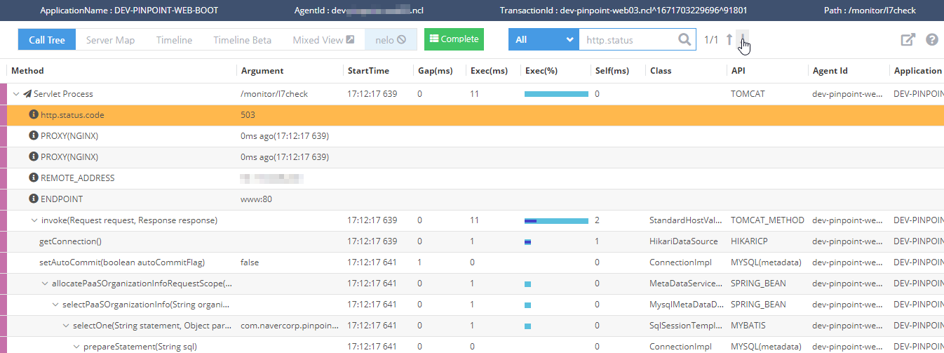 그리고 해당 점들을 드래그하면 각각의 요청 트랜잭션에 대한 스택 트레이스(프로그램이 시작된 시점부터 현재 위치 까지의 메서드 호출 목록) 을 확인해볼 수 있다.