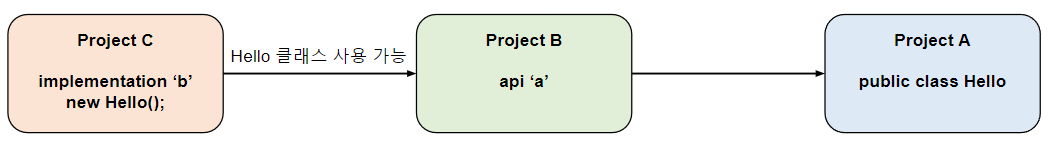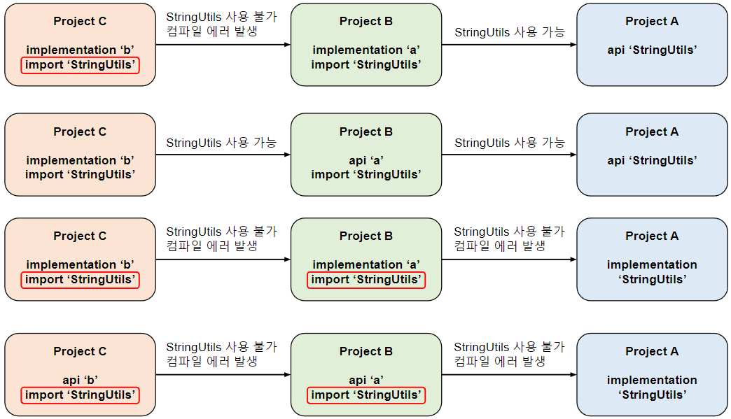 Project C에서는 Project B에 implementation를 통해 의존하기 때문에, Project B에 있는 컴파일 경로, 런타임 경로들이 노출된다. 그리고 Project B는 api를 통해 Project A에 의존하고 있으므로, Project C에서도 Project A가 사용 가능하다.