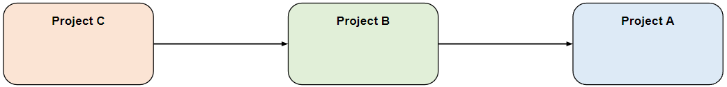 예를 들어 다음과 같은 구조의 3개의 프로젝트가 있다고 하자. Project C는 Project B에 의존하고 있고, Project B는 Project A에 의존하고 있다. 그러면 Project C도 Project A에 의존하게 되는데, 이를 전이 의존성 또는 추이 의존성(transitive dependency)이라고 한다.