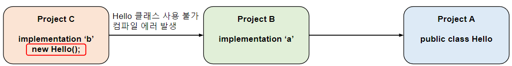 하지만 implementation으로 선언된 전이 의존성은 사용이 불가능하다. 아래의 경우에는 Project B에서 implementation를 사용하여 Project A에 의존하고 있으므로, Project C에서는 Project A의 코드에 접근이 불가능하다. 만약 Project A의 코드에 접근하려고 하면 컴파일 에러가 발생한다.