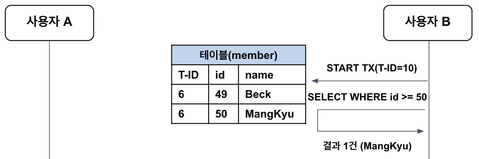 예를 들어 사용자 B가 트랜잭션을 시작하고 name = “Minkyu”인 레코드를 조회했다고 하자. 해당 조건을 만족하는 레코드는 아직 존재하지 않으므로 아무 것도 반환되지 않는다.