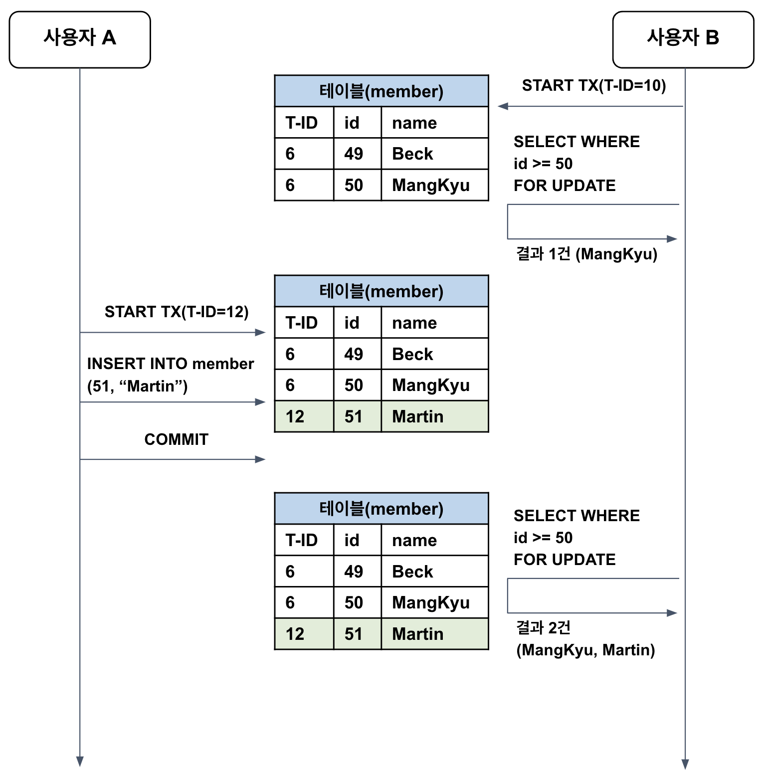 사용자 B는 트랜잭션을 시작하고, 잠금없는 SELECT 문으로 데이터를 조회하였다. 그리고 사용자 A는 INSERT 문을 사용해 데이터를 추가하였다. 이때 잠금이 없으므로 바로 COMMIT 된다. 하지만 사용자 B가 SELECT FOR UPDATE로 조회를 했다면, 언두 로그가 아닌 테이블로부터 레코드를 조회하므로 Phantom Read가 발생한다.